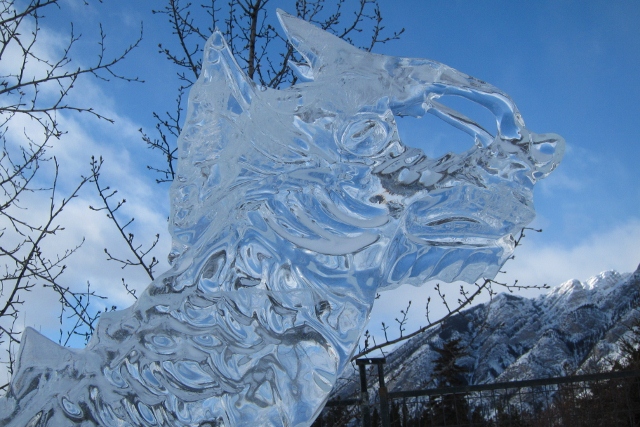 The photo ops are few today, but as I walk along the river in Banff I come across an ice dragon!