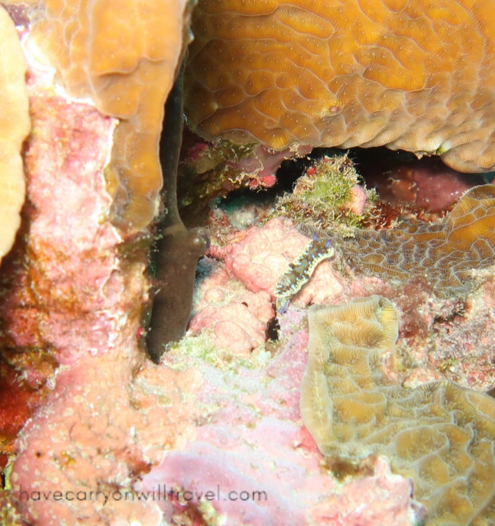 Dive two is another coup. With no wind the kite boarders are taking the day off. The sites near the beach where the kiters start from are usually a bit dicey because the boards they use have a 4′ foil for a keel and if they are not planing this sticks under the water. It would not be good to be hit by one of those. Red Beryl is one of those sites and we dive it today. It is the site that has produced the most interesting wild life to date. A small crab chilling in a crevice, a couple of Slender File Fish, and a huge Green Moray out for a morning swim. Debbie is small and this eel had her eyed up as brunch but after closer inspection decided against it.