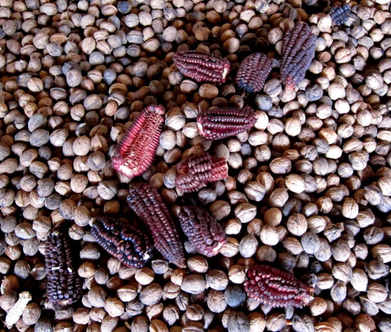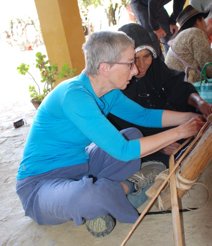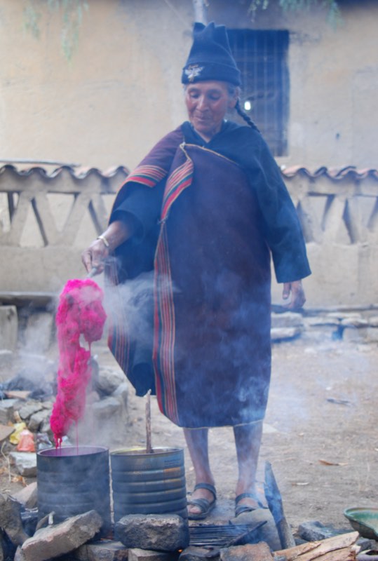After lunch of vegetable soup and picante chicken with pasta, we learn how to spin and dye wool and weave. Spinning wool onto a large bobbin is much harder than it looks, I keep breaking it by pulling too hard. The young girl showing me is very patient and laughs along with me. Murray tries spinning a finer thread and the local women have fun with him.