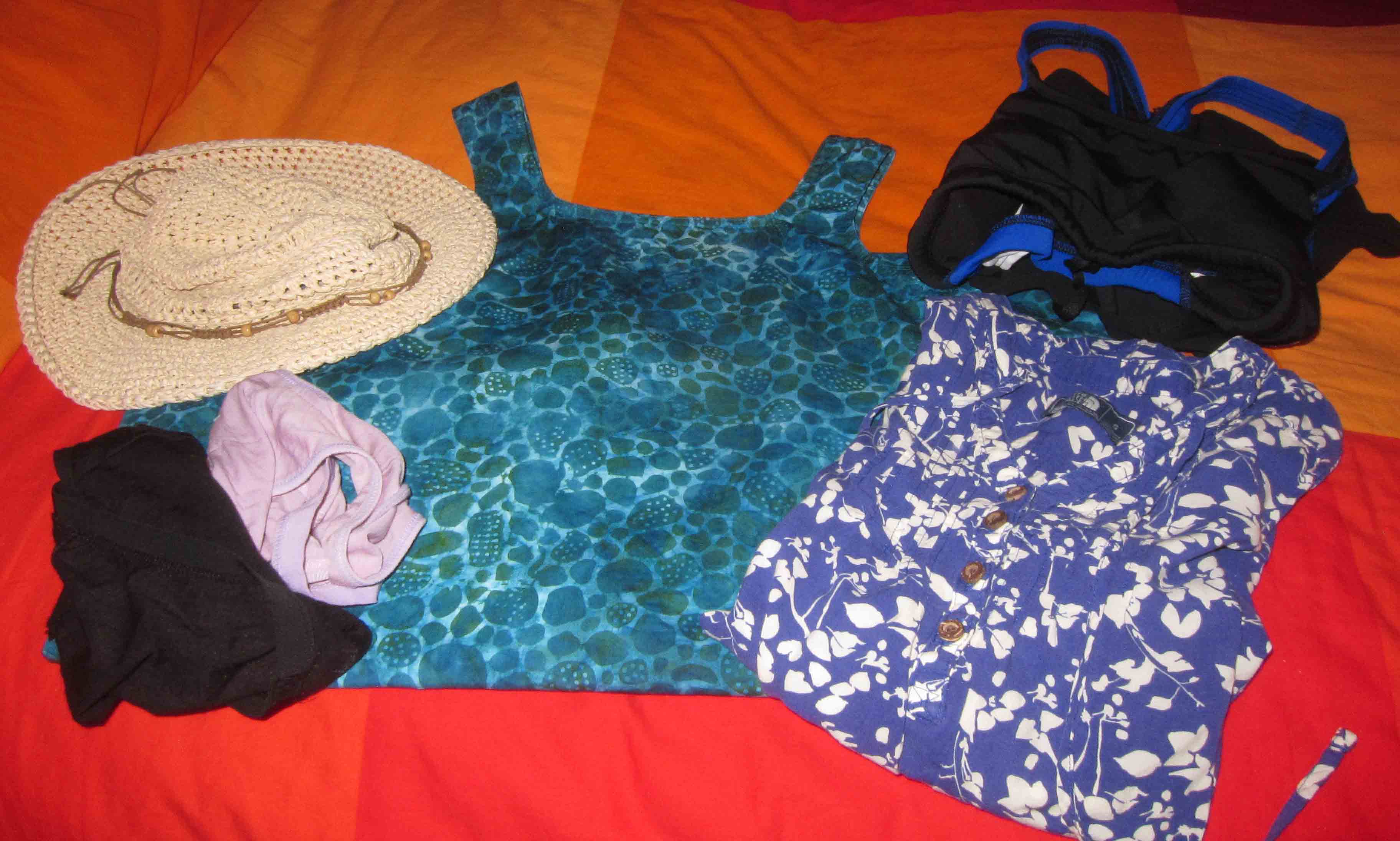 If I take off the list what I am wearing on the airplane, what is packed is reduced to the dressier shirt, dress, 2 undies, 3 swimsuits, flip flops and sunhat. Not much. One of the swimsuits is used for padding around my camera housing, so only 2 actually have to be packed.
