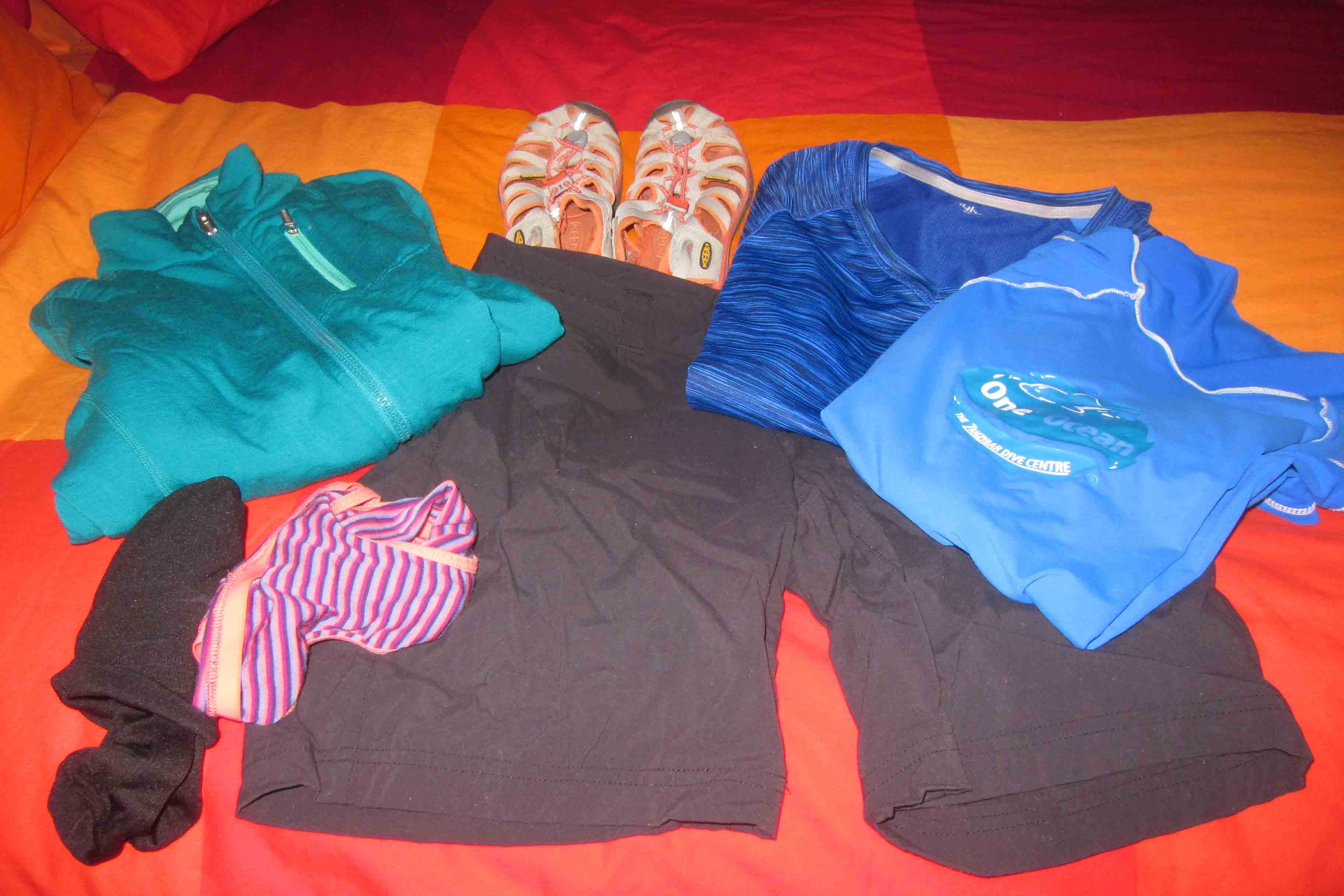 Clothes being packed (flip flops and 2 swimsuits not shown)
