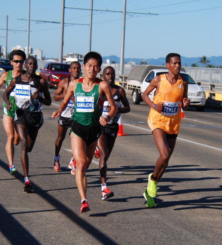 The lead group is small, they are following a pace runner. Mostly Japanese and Africans. The Africans legs would measure up to my shoulders they are so tall and lean and they are so graceful in their movements, and appear to run effortlessly.