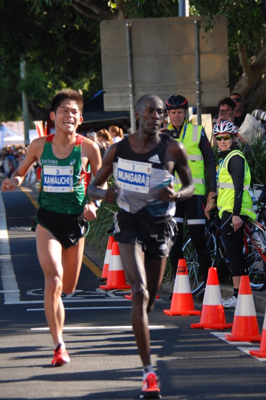 As they round the corner, Mungara shows no expression on his face while the Japanese fellow looks to be in pain. They sprint to the finish, which is amazing since they just ran 42 kms. Mungara wins by one second at 2:09!