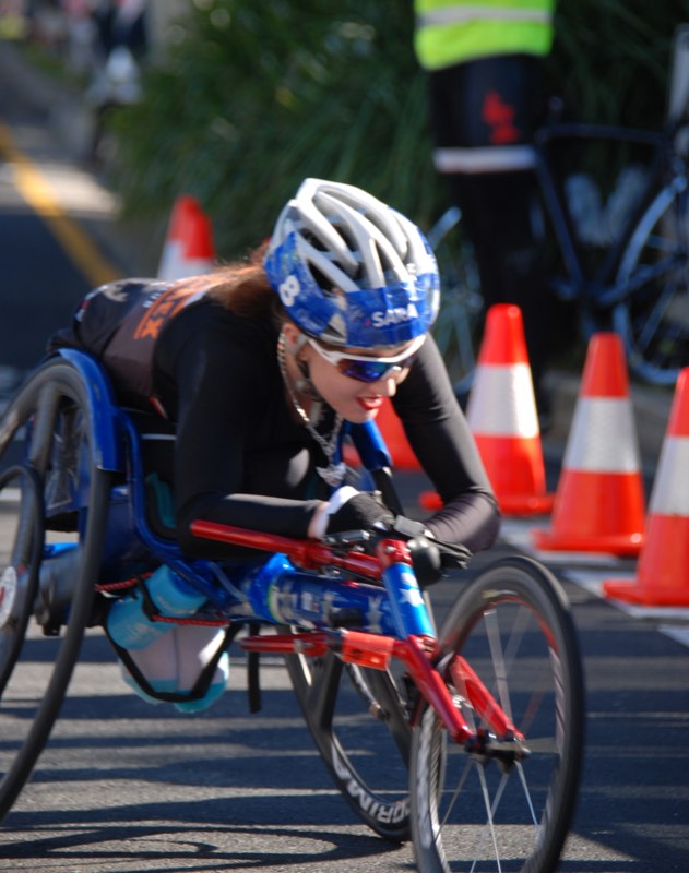 One of the marathon wheelchair athletes spins by. She looks like she has been working hard. I clap for her and her effort.