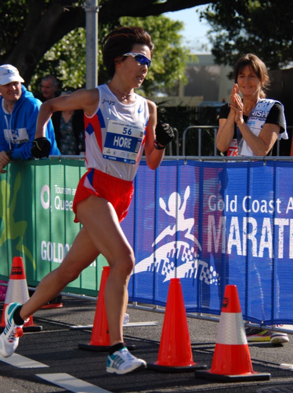 Shortly after, the first woman races by. A Japanese going hard for the finish line to finish in 2:26.