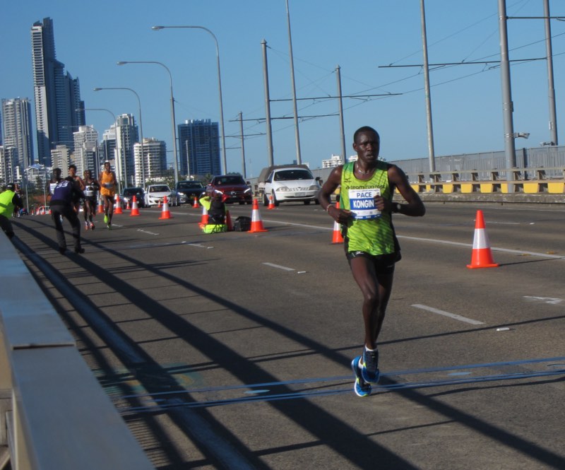 The Gold Coast Marathon starts at 7:20 this morning. Murray and I calculate when they will run past the 30 km mark near M&D’s condo building. We walk out to the bridge at about 8:30. We can see the runners getting closer and closer by the helicopter hovering in the air above the lead group.