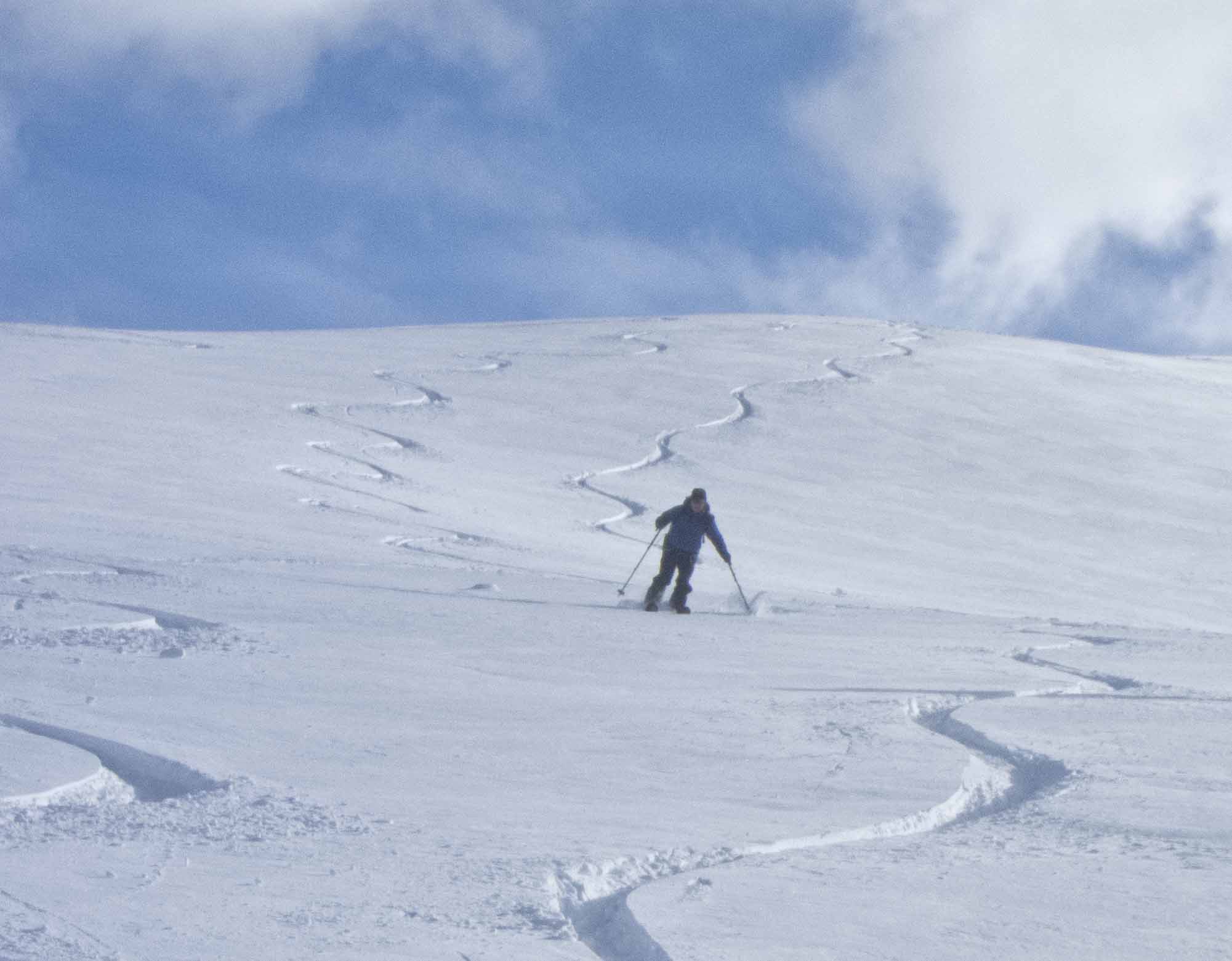 The up track is reasonably easy, the snow is new, it’s deep but the skis only sink about 10 or 15 cm. The snow changes a few times on the way up. It is soft in the valley bottom, half way up it is dense, by the top the wind has made a crust, not scary break thru crust but definitely solid. Skiing down is not bad, the turns are tough but surely doable. 2 runs and we call it a day.