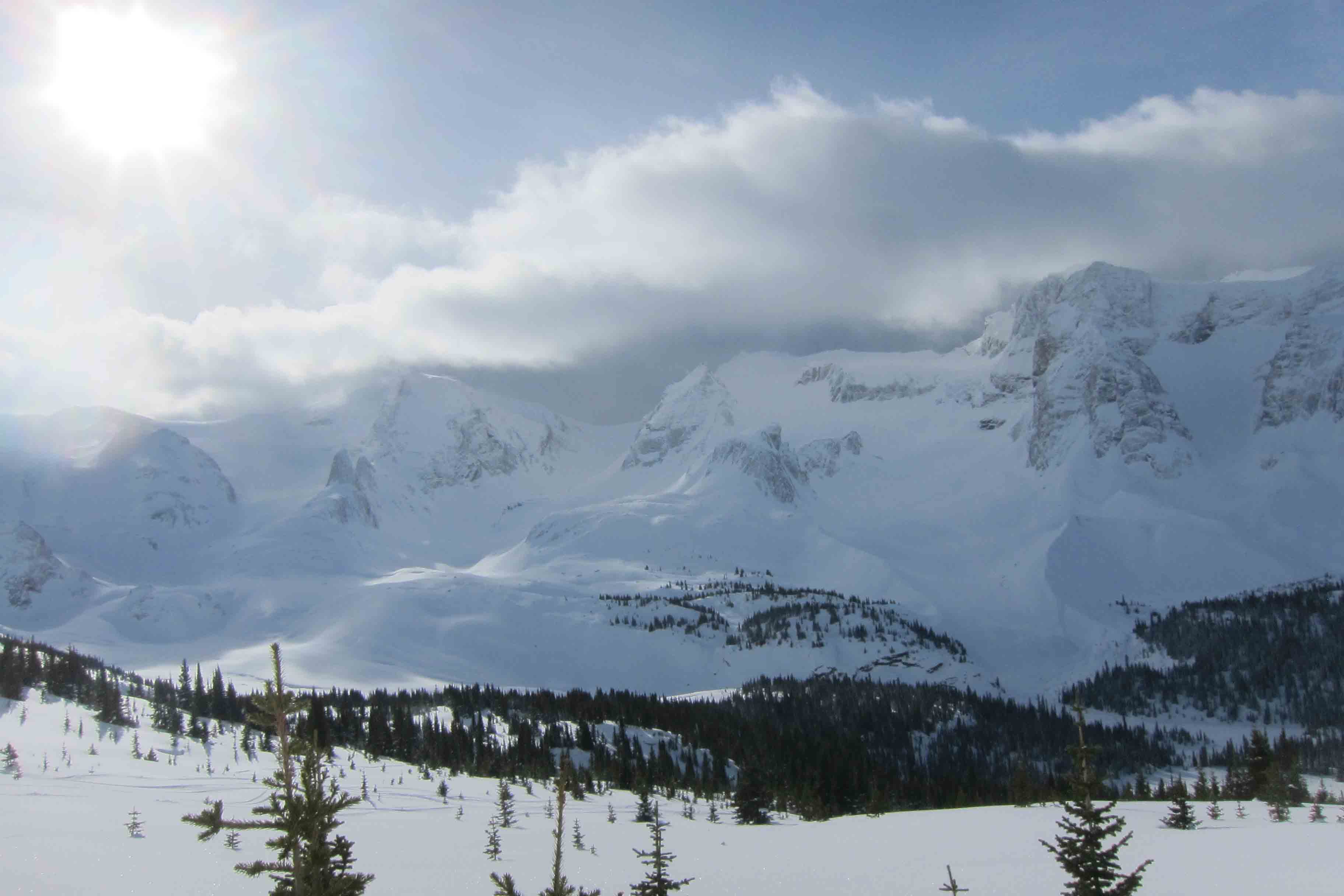 The up track exists to Heather Ridge and if we choose the right way down it is a mostly wide open and gentle slope. Perfect to get Debbie down on her inaugural journey into the backcountry. In control and patient turns all the way to the bottom. Only one crash and she is up and back on the skis in no time.