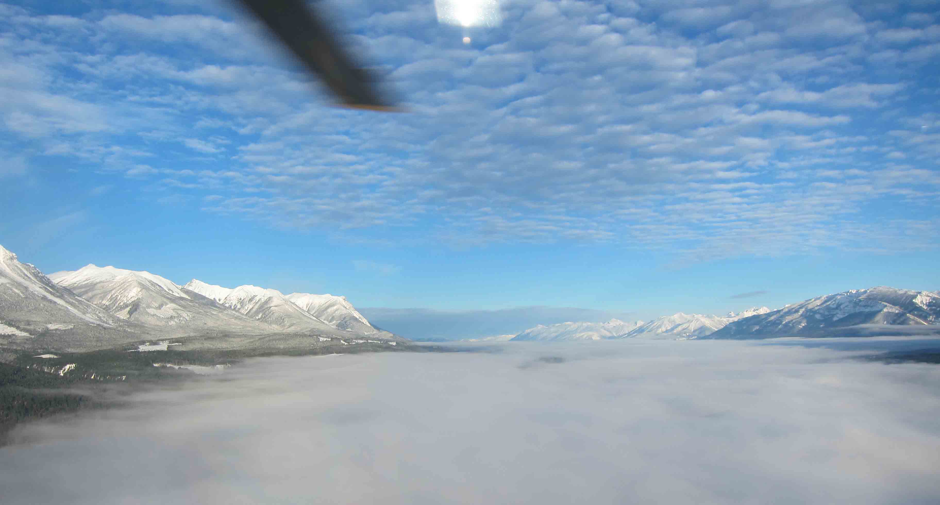 Yesterday was a bad day for flying and a couple of groups did not make it into the lodges they were headed for. So today the heliport is busy. Somehow we end up on the ‘big bird’, the 212. This helicopter has a passenger capacity of 14. They took four seats out to carry gear. So with only 8 of us going in and 9 headed out they were able to do the exchange in one trip. There is a thin layer of fog over the river but once we lift above it was a clear and blue day. As it is only one flight it was about 30 minutes and more direct, right over the mountains rather than following the valleys. Over the mountain tops we go. Never been on the bigger heli and never been on such a long ride. It was definitely a trip for the record books.