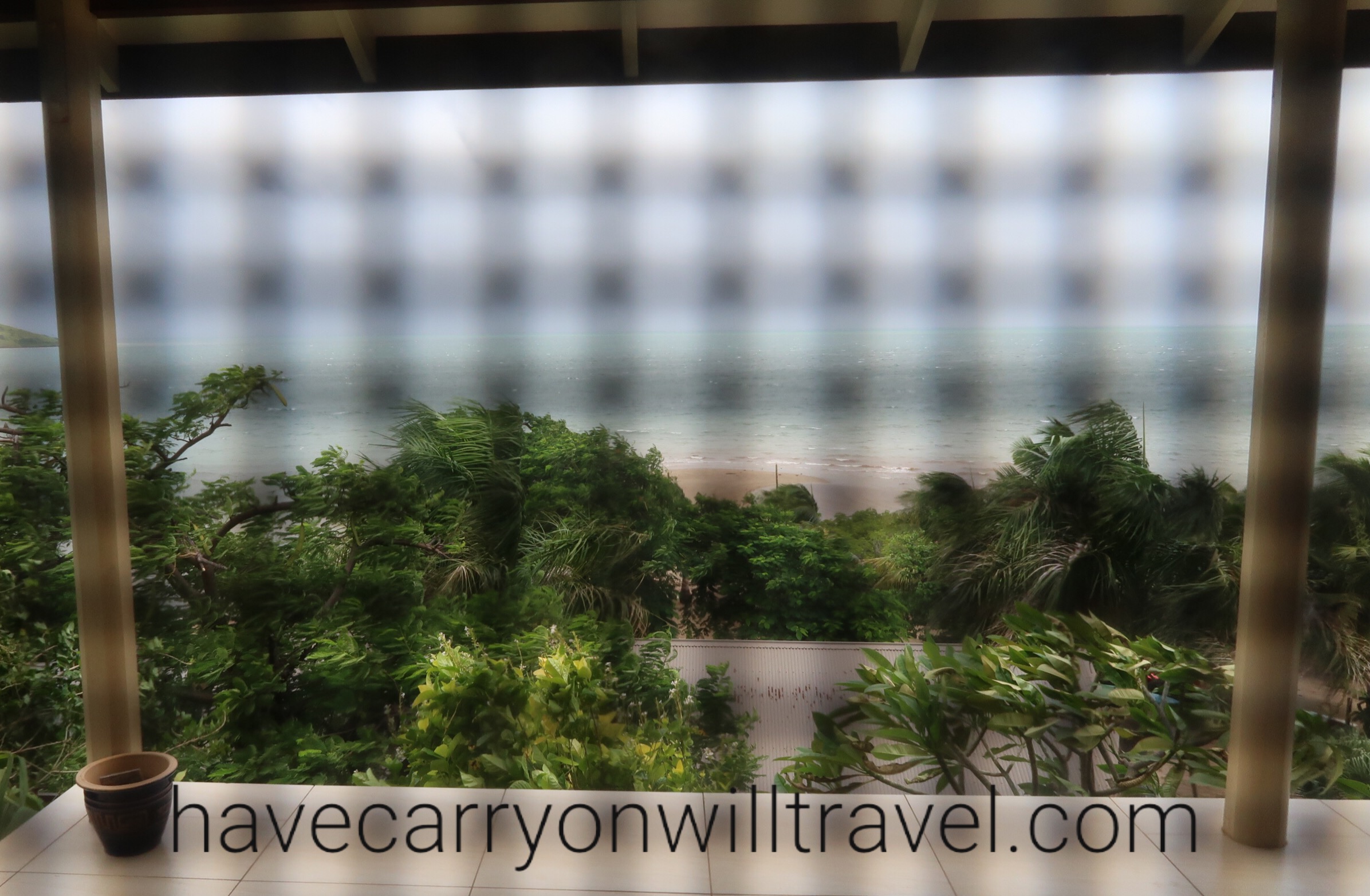 We unpack, organize our very nice ocean view bungalow, enjoy a tasty supper while watching the alternating rain and wind gusts, and then struggle to keep our eyes open. We crash at 8:30. Lights out.