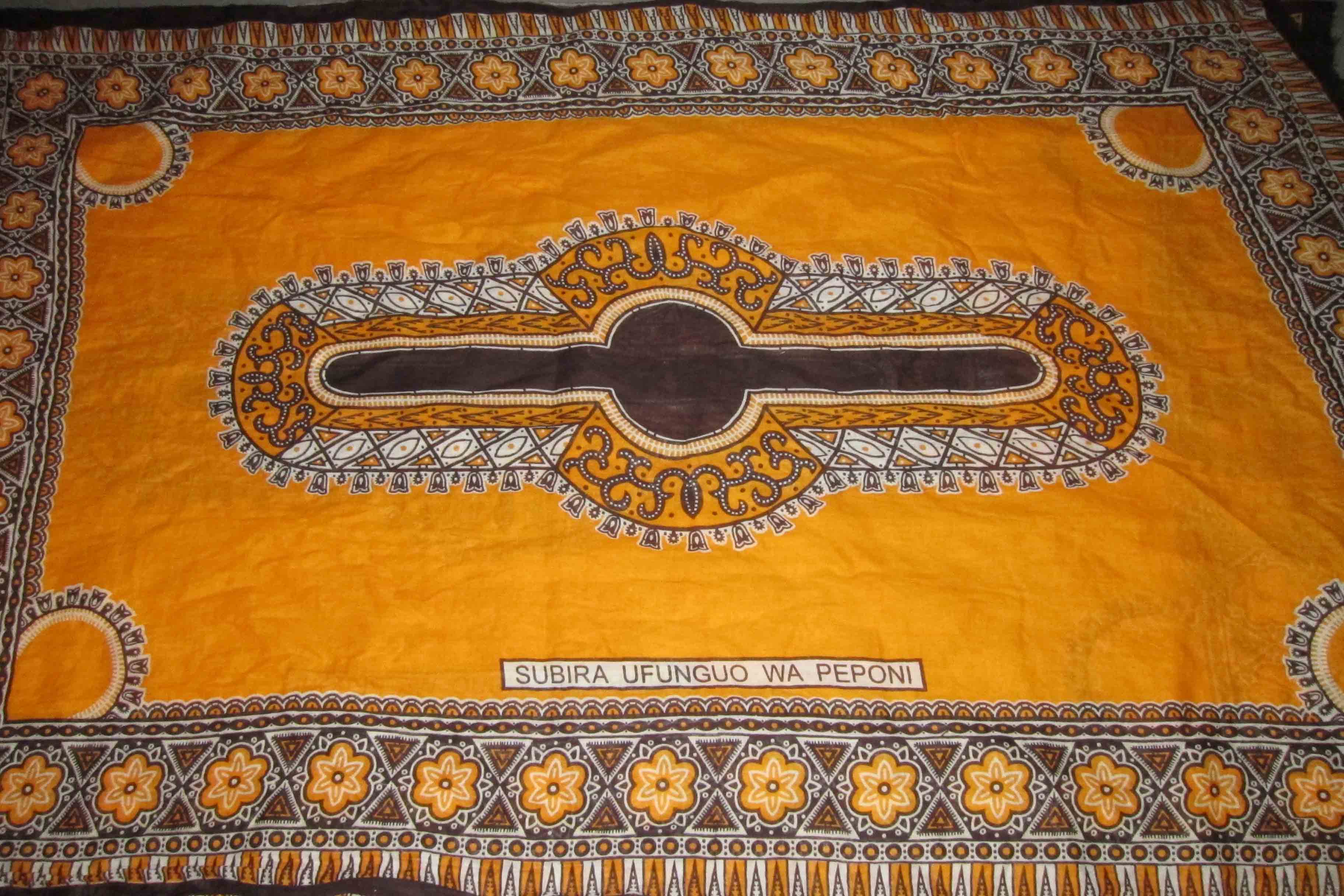 A kanga is about 36 inches wide and about 60 inches long. They are usually bought in pairs and worn in pairs. The pair is called a “doti”. One kanga is for a skirt and the other for a shawl or “tube” top, or even to gift to a friend. Each kanga has a Sawhili saying imprinted on it.