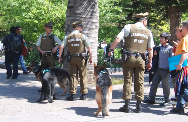 There is a definite police presence in the plazas downtown. Police on foot, police on horseback and police with dogs. They seem to be in place to discourage the pick pockets and petty thieves. They chat with folks who stop andĀ ask questions, so they are friendly, if not the dogs, who look ready to pounce on someone.