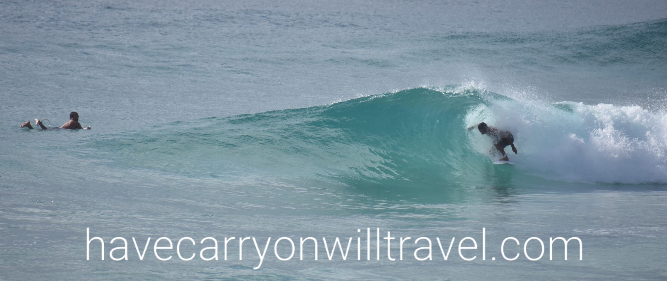 A short walk later we are shedding our shorts and T-shirts to tackle the smaller waves on the beach. The water is cool but not icy and amazingly clear. There are even a few fish under the surface. The sand is smooth and gentle on our feet. The waves, however, are a little intimidating for this prairie girl. M, having played this game for a couple of years now, handily body surfs even the larger waves. I just bob over them like a cork or dive under them like a seal.
