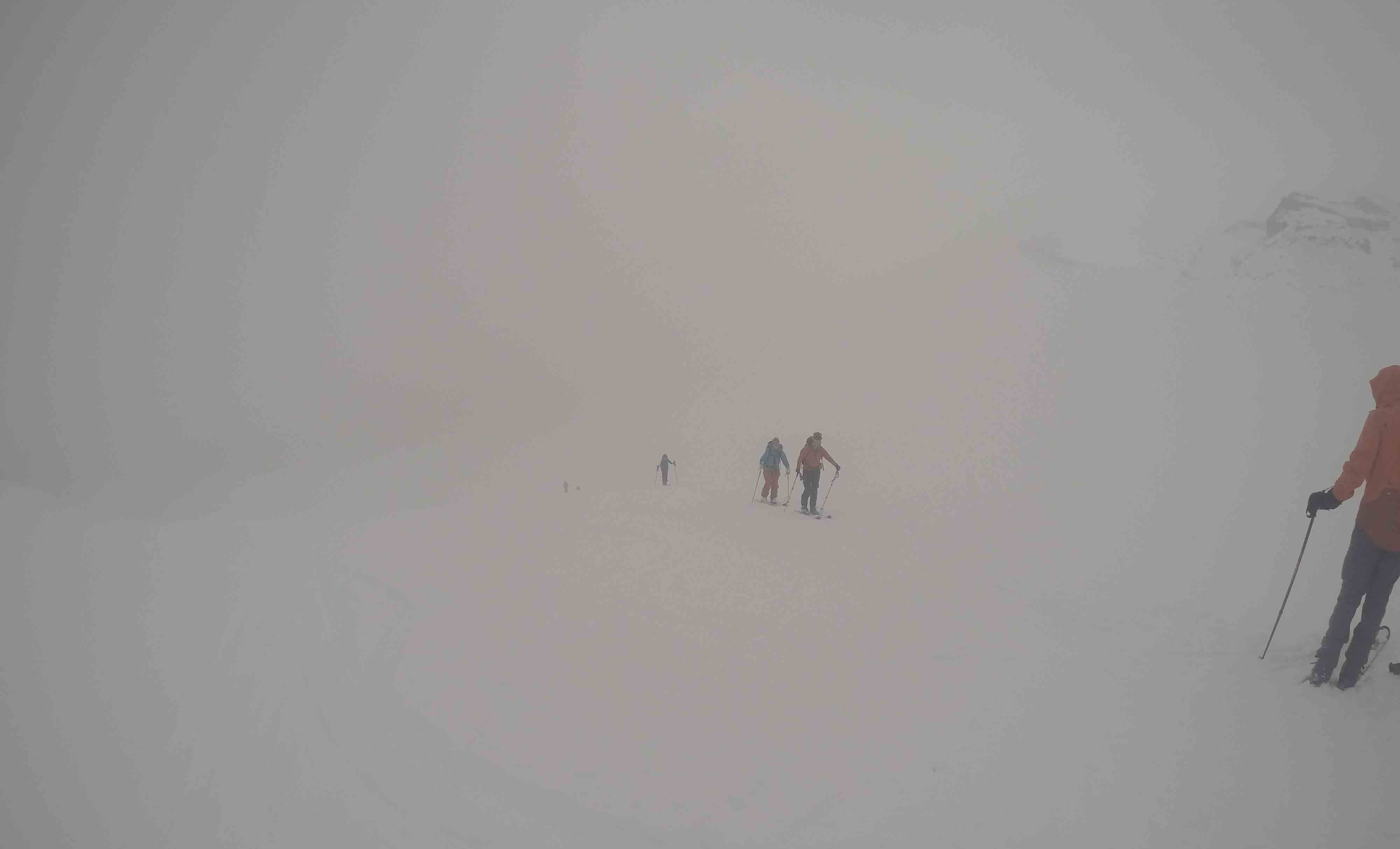 The ski down is great! New powder, trackless expanses to choose from. We gather at about 3 /4 of the way down the big slope.
