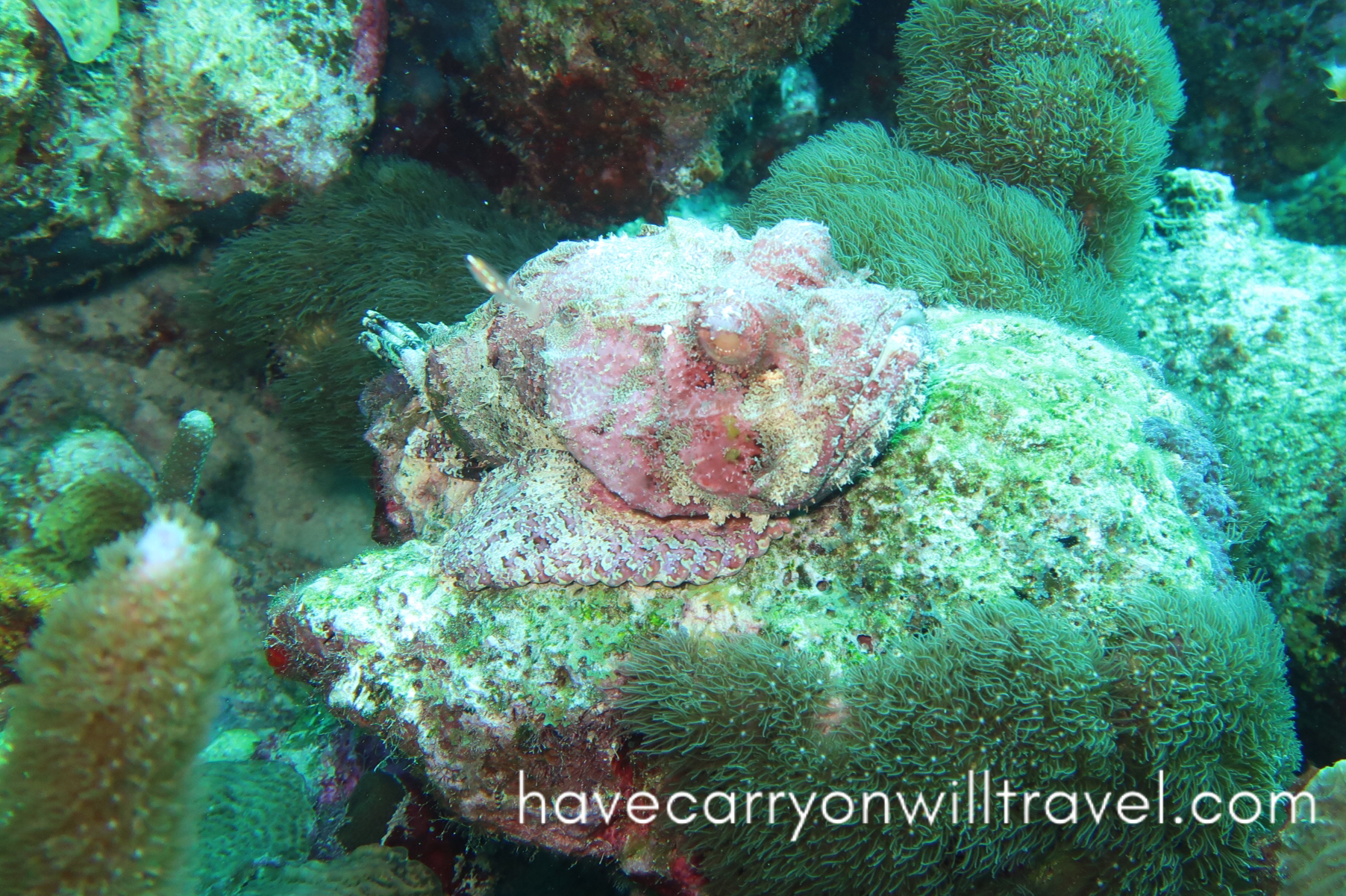 Bonaire designated the reef surrounding the island a national marine park in 1979. Long before it was the ‘in’ thing to do. The result is a very healthy reef with such abundant life it is hard to find those unusual creatures.  Debbie finds a small hairy crab stuck in a crack in a rock. Two squid are hanging about in the shallows. C & D stumble across a couple of Scorpion Fish. I find another juvenile Trunk Fish. But the rare stuff is hidden very well and we do not spot any.